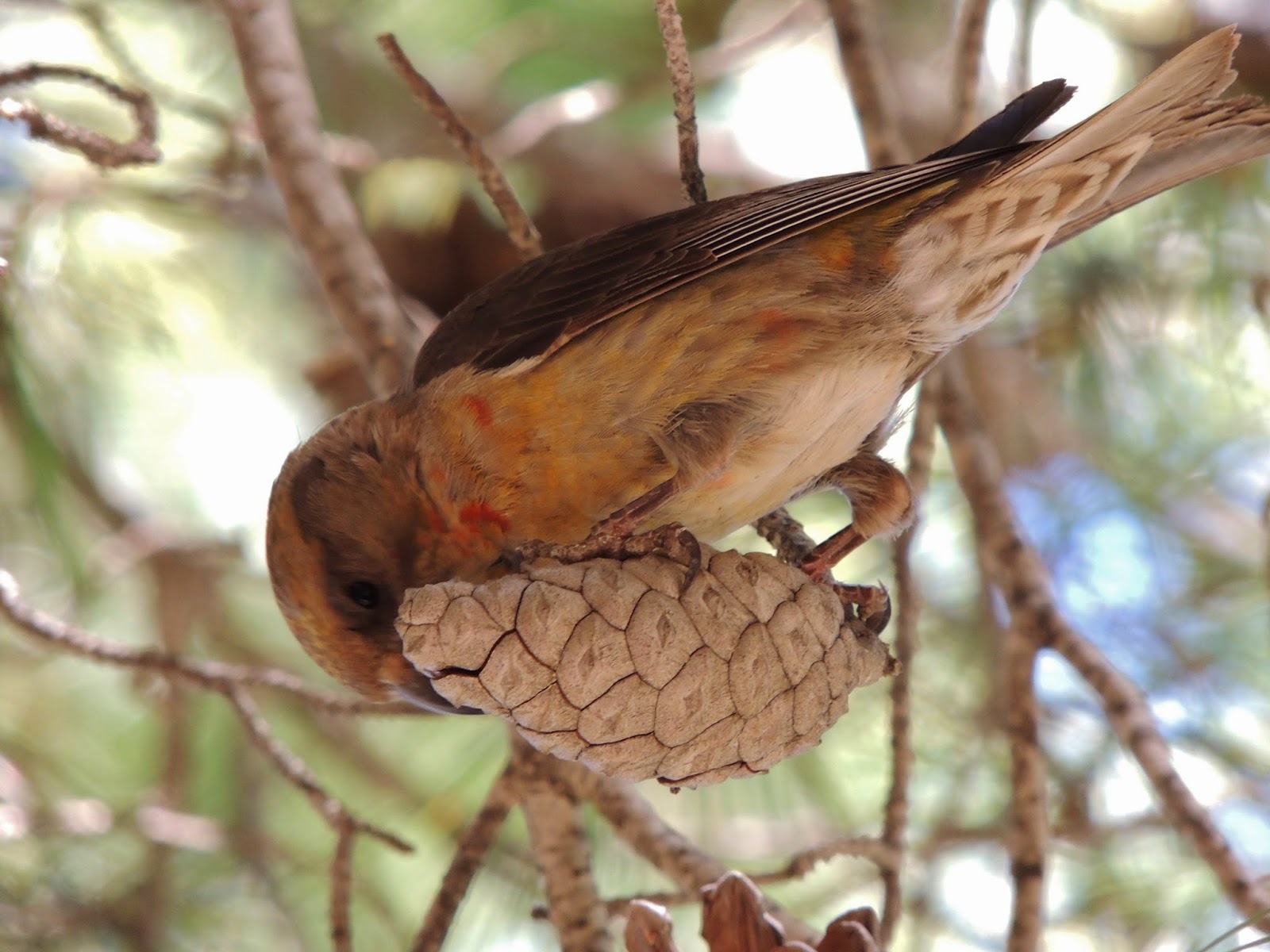 Tras la jornada de anillamiento y la rutinaria visita a la desembocadura del río Algar, decidimos ir a comer al merendero del Faro del Albir en busca de algo de sombra y poder ocultarnos del tórrido Sol. Aquí conseguimos sacar las siguientes fotografías de un macho de piquituerto acompañado de sus tres polluelos. Mientras se alimentaban hacían caso omiso de nuestra presencia y continuaban con su tarea de abrir las piñas y sustraerle los piñones. Durante la sesión de fotos pudimos comprobar con que destreza estos peculiares pajarillos se las apañan para hacerse con las semillas.